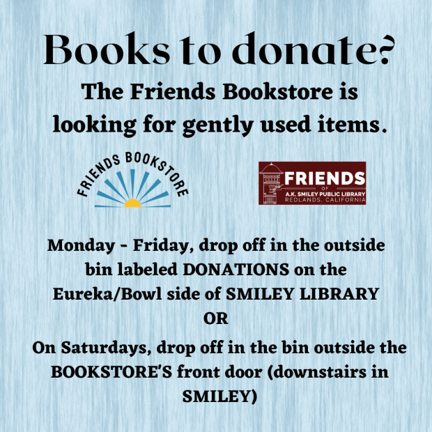 The A.K. Smiley Bookstore is the largest library bookstore in Southern California. We carry thousands of used books for sale in-store. Come find us on the lower level of the A.K. Smiley Public Library in Redlands, California for a huge selection of Best Sellers, Classics, Collectibles, and Antiquarian books. We also have a large variety of movies and puzzles!
